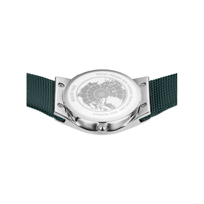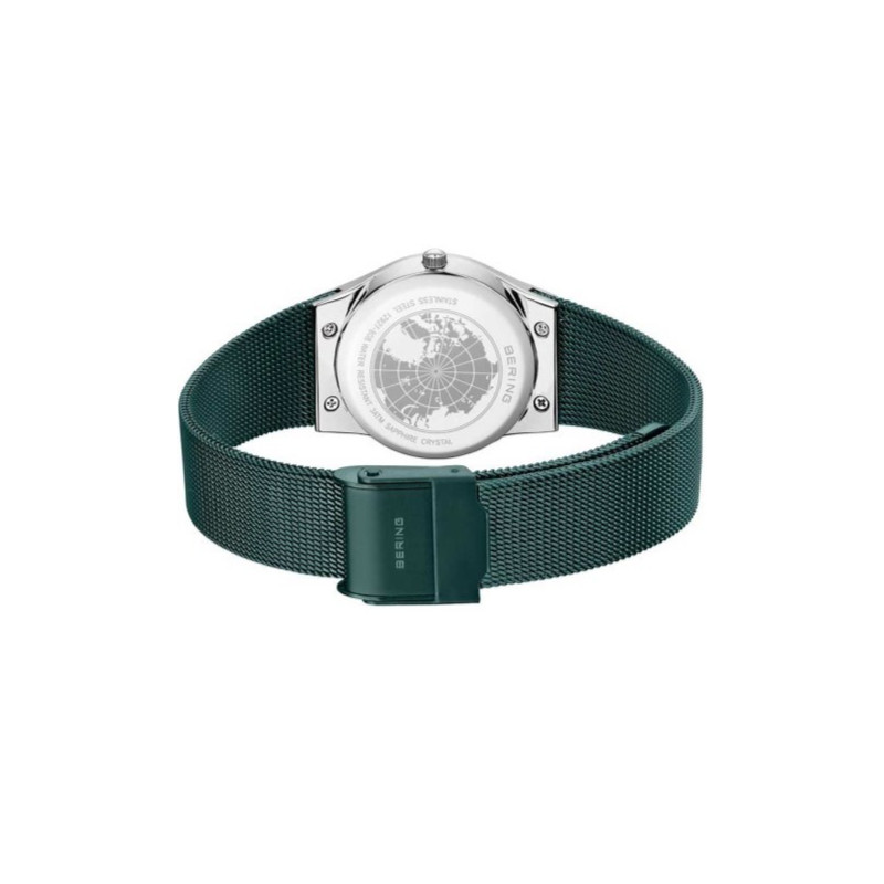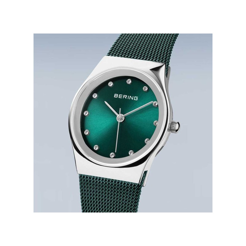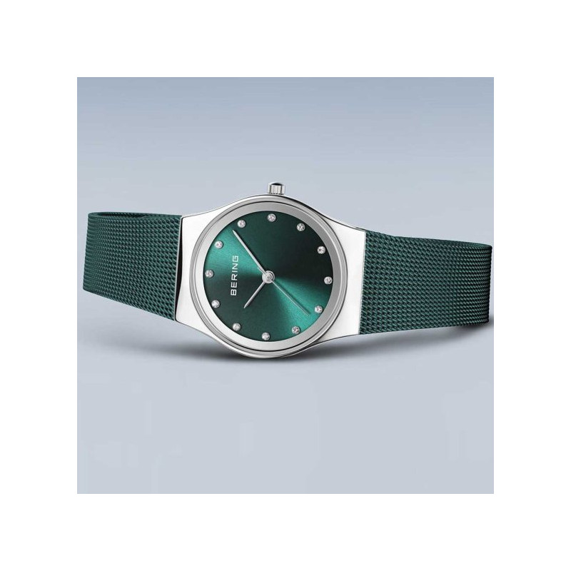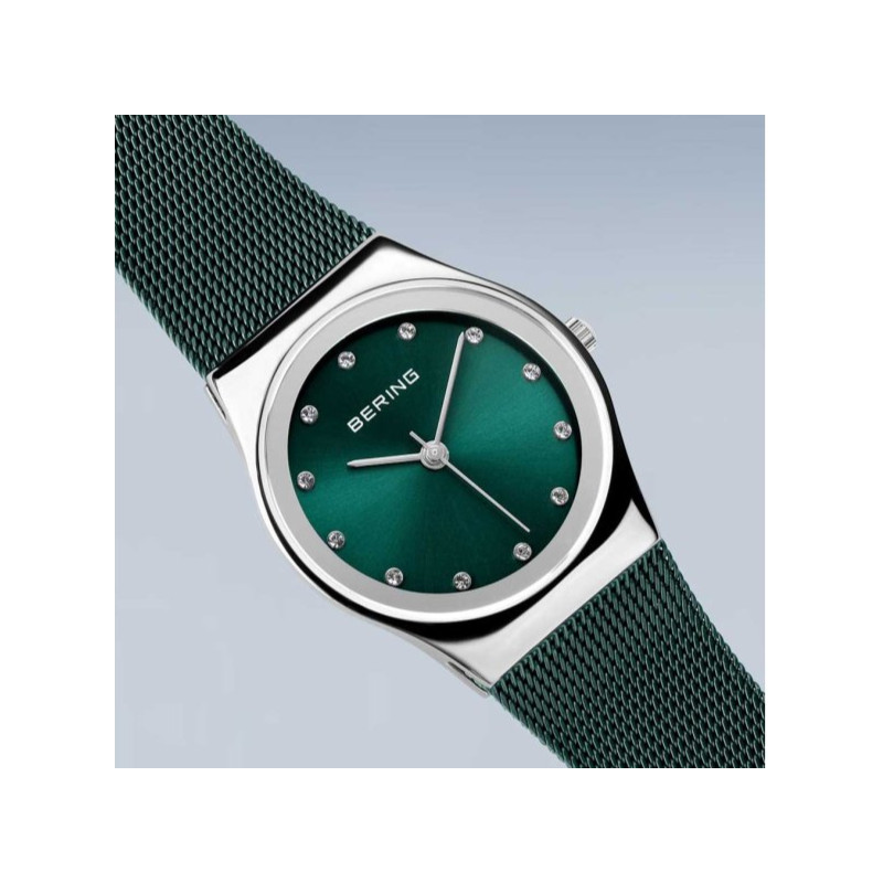 Značka a model: Bering 12927-808 Classic Určenie: dámske hodinky (elegantné / módne) Modelová rada: Classic Sklo: zafírové sklo Puzdro: nerezová oceľ, priemer 27 mm, hrúbka približne 5–6 mm Ciferník: zelený sunray ciferník s krištáľovými indexmi Swarovski Náramok: zelený milánsky remienok z ušľachtilej ocele s posúvacou zapínacou sponou...