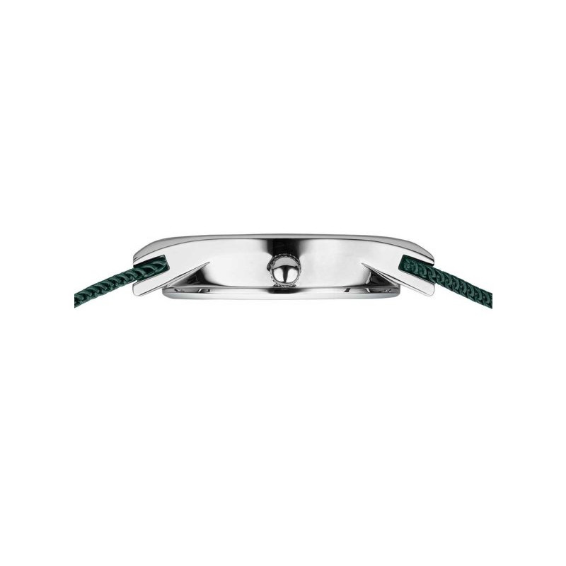 Puzdro hodiniek je vyrobené z kvalitnej nerezovej ocele s priemerom približne 27 mm a výškou 5–6 mm, čo vytvára jemný profil na zápästí. Suchý a čistý strieborný odtieň ocele pôsobí nadčasovo a harmonicky ladí so zelenými tónmi ciferníka aj remienka. Hodinky sú ľahké a komfortné pri nosení, čo je charakteristické pre túto veľkosť puzdra u dámskych modelov.