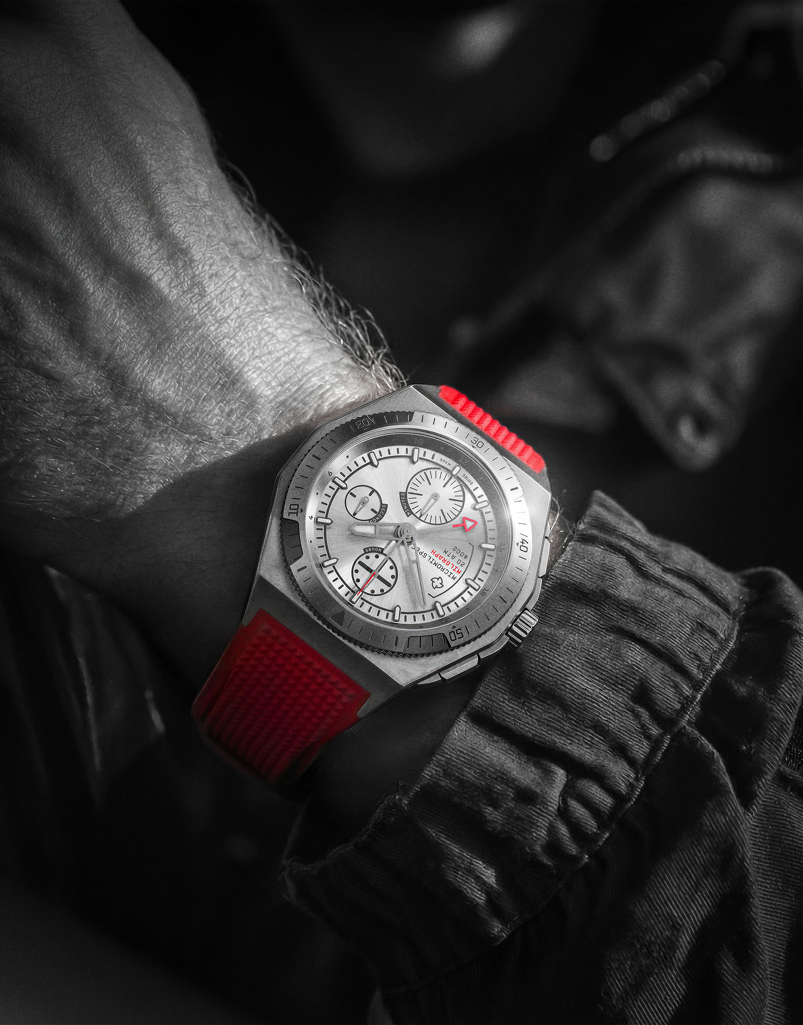 Micromilspec Milgraph T5 dokazuje, že aj malé zmeny v dizajne môžu mať veľký dosah. Zmena z oranžových detailov na červené je zdanlivo malá, no výsledok je omnoho ostrejší a čistejší. Červená, biela a čierna sú nemennou kombináciou v dizajne a na Milgraphe T5 pôsobia isto a funkčne.