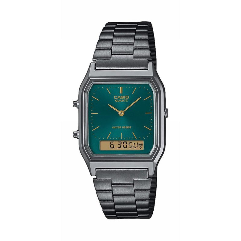 Pánske náramkové hodinky Napájanie z batérie Strojček 1301 Priemer puzdra 27,8 mm Puzdro v tvare štvorca Plastové puzdro Šedá farba puzdra Oceľový remienok Šedá farba remienka Kombinovaný ciferník Zelená farba ciferníka Ciferník s dvanástimi indexmi Materiál skla - plast Odolné voči vode pri bežnom nosení Dátum Stopky Budík Druhý čas