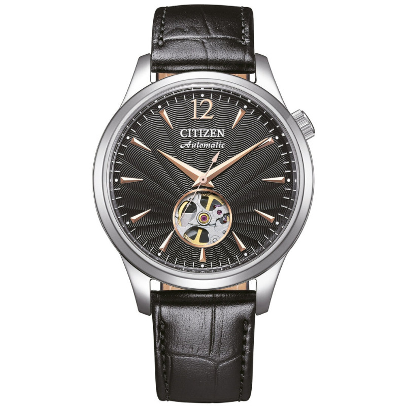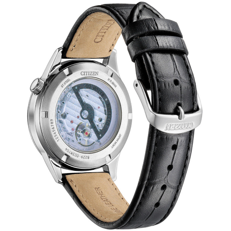 Značka: Citizen Model: Citizen Elegant Automatic NH9131-14E Puzdro: Ušľachtilá oceľ, priemer 40 mm, minerálne sklíčko Ciferník: Čierny ciferník s kovovými indexami Remienok: Koža Mechanizmus: Automat Citizen 8229 Vodotesnosť: 50m / 5ATM