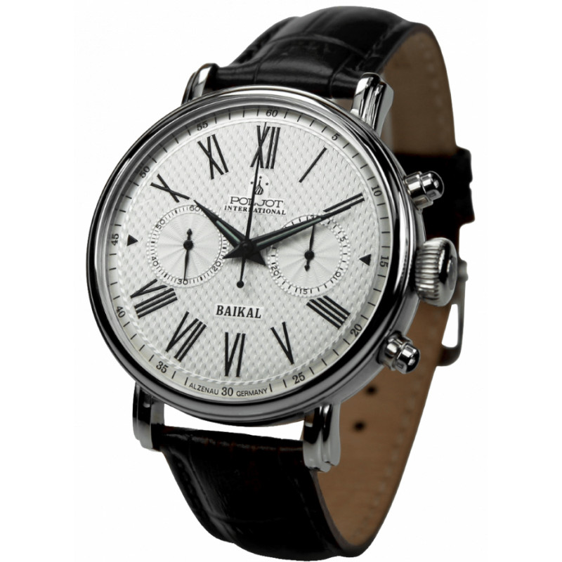 Model: Poljot International Bajkal 2901.1940911 Puzdro: Ušľachtilá oceľ, šírka 43mm, zafírové sklíčko Ciferník: Strieborný gilošovaný s čiernymi indexami a ručičkami Remienok: Čierny, kožený Mechanizmus: 2901 ručný náťah s chronografom, rezerva chodu 45 hod. (37 hod. pri spustenom chronografe) Vodotesnosť: 50m / 5ATM