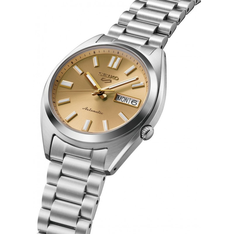 Značka a model: Seiko 5 Sports SNXS ´Gold Cufflinks´ Určenie: pánske hodinky (elegantné / klasické) Modelová rada: Seiko 5 Sports Sklo: Hardlex Puzdro: nerezová oceľ, priemer 37,4 mm, hrúbka ~12,5 mm Ciferník: zlatý číselník s efektom slnečného brusu a indikáciou dňa a dátumu, ručičky a indexy s luminiscenčnou vrstvou Náramok: strieborný, oceľový...