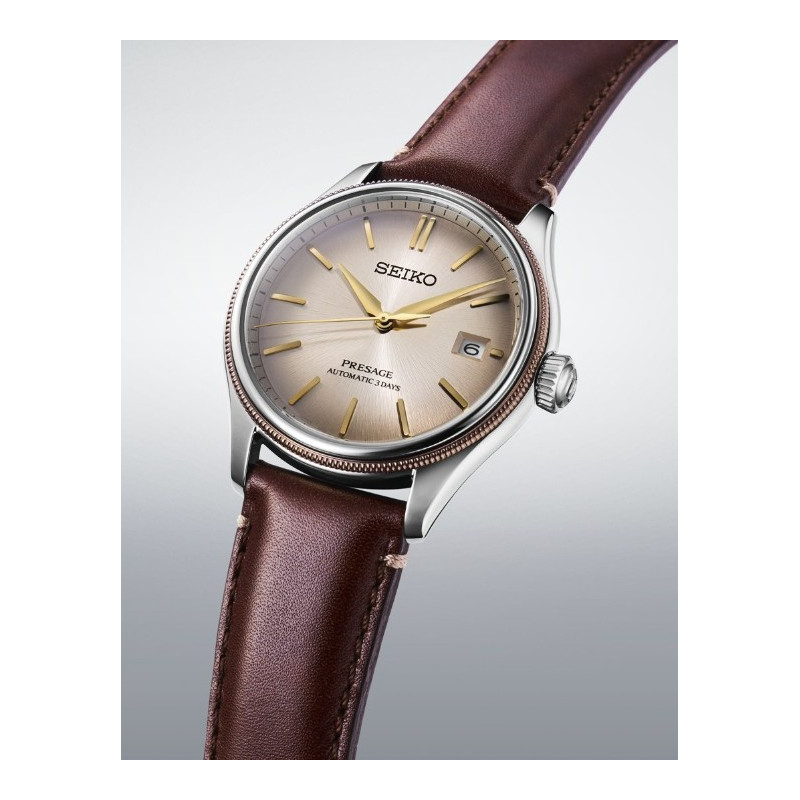 Značka a model: Seiko Presage Classic Upcycled Leather Strap Limited Edition Určenie: pánske hodinky (elegantné / klasické) Modelová rada: Seiko Presage Sklo: Zafír Puzdro: nerezová oceľ, priemer 40,2 mm, hrúbka ~13 mm Ciferník: béžovo-hnedý so zlatými ručičkami a indexami Náramok: kožený, hnedý Vodotesnosť: 10 bar (100 m) Strojček: 6R55...