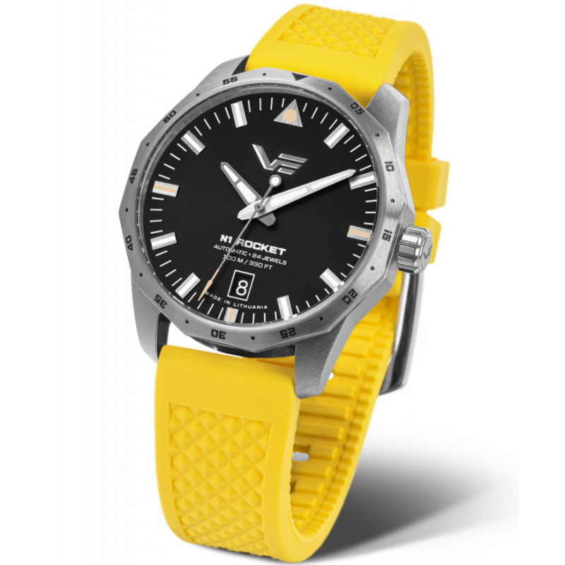 Značka: Vostok Europe Model: Vostok-Europe N-1 ROCKET Compact automatic NH35-125A747S Puzdro: Ušľachtilá oceľ, priemer 39 mm, K1 sklíčko Ciferník: Čierny ciferník s indexami a ručičkami potiahnutými luminiscenčnou vrstvou Remienok: Silikón Mechanizmus: Automat SEIKO NH35 Vodotesnosť: 100m / 10ATM