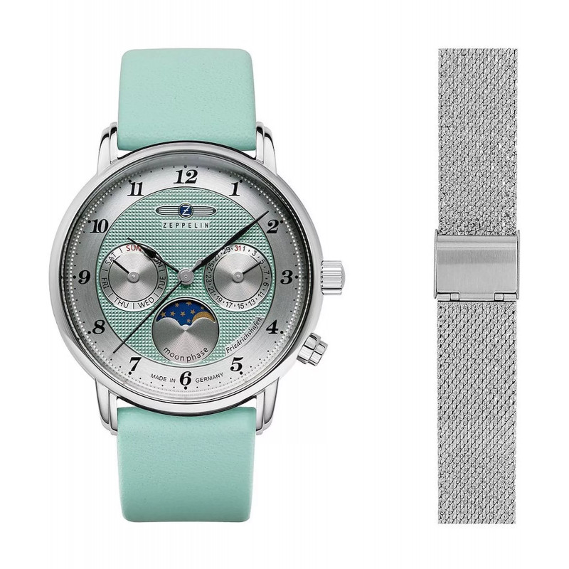 Značka: Zeppelin Model: Zeppelin Friedrichshafen Moonphase 8537-2_set Puzdro: Ušľachtilá oceľ, priemer 36 mm, minerálne sklíčko Ciferník: Tyrkysový ciferník s funkciou fázy mesiaca Remienok: Teľacia koža Mechanizmus: Quartz. Ronda 706.1 Vodotesnosť: 50m / 5ATM